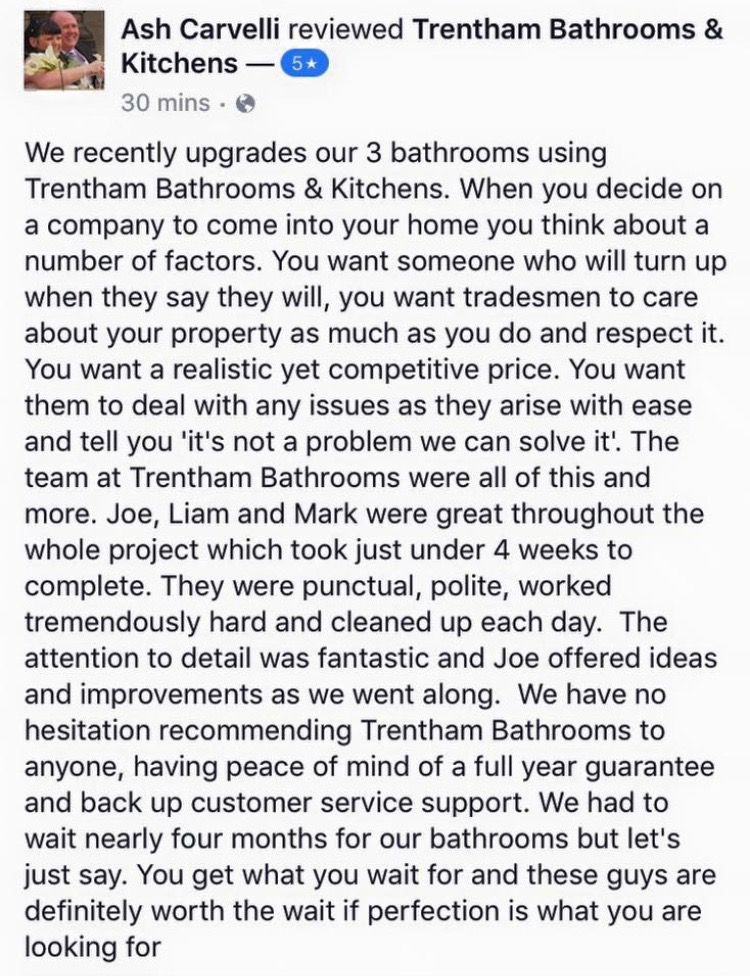 Below are pictures of a Main Bathroom and the customers testimonial that has been added to our Facebook page.