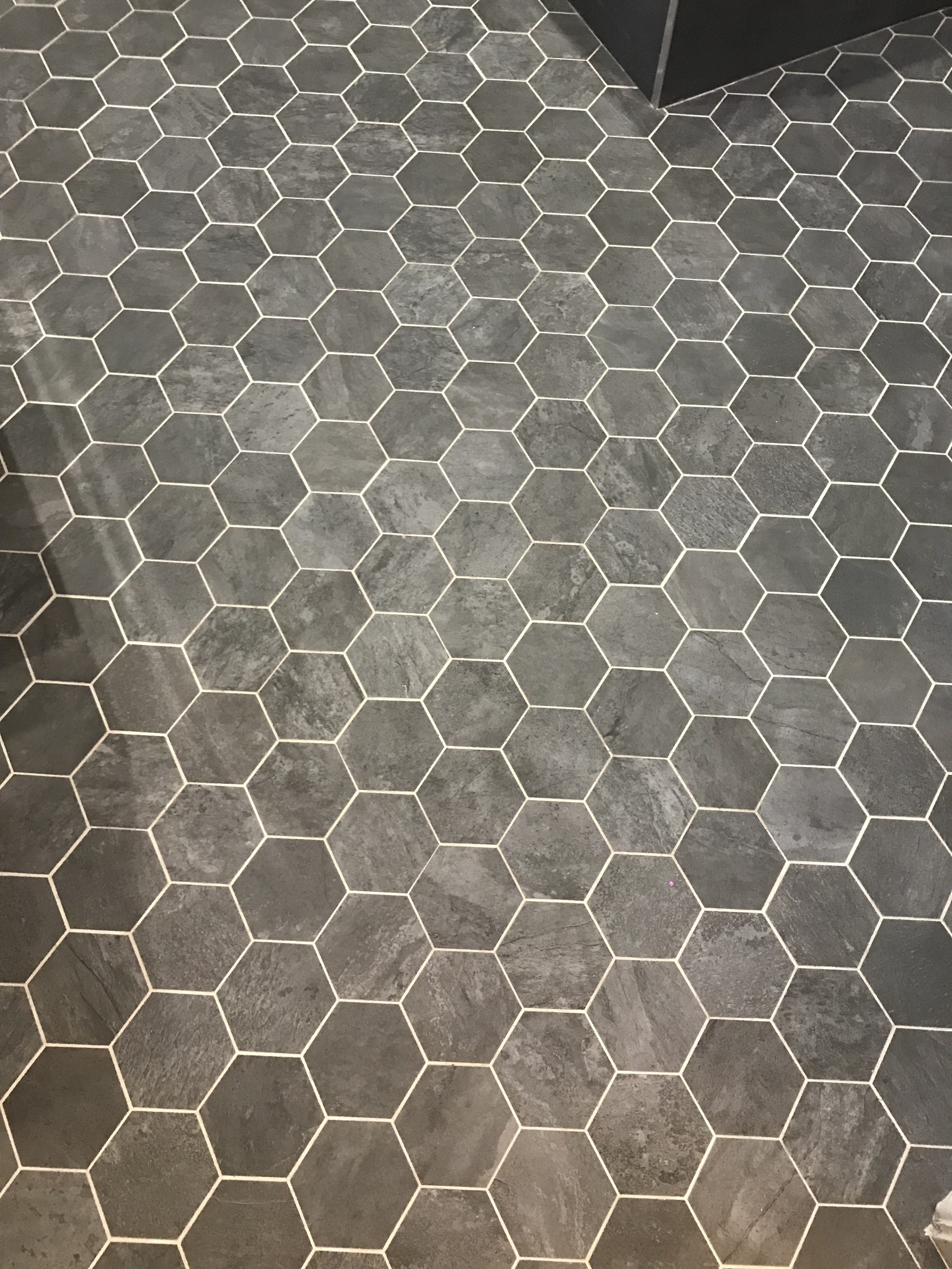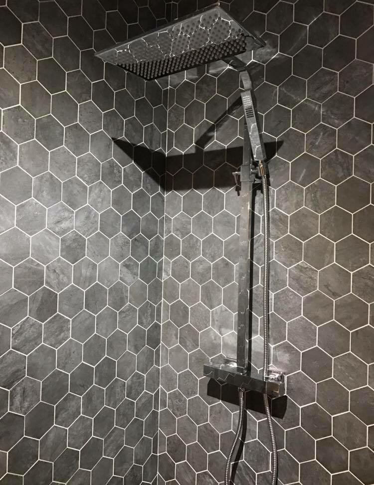 This is a recent Bathroom install we have completed in Stoke-on-Trent. As you can see from the pictures below, this elegantly designed space features striking hexagon tiles adorning both the shower area and floor, perfectly complemented by anthracite 30×60 porcelain tiles throughout the rest of the room and on the bath panel.