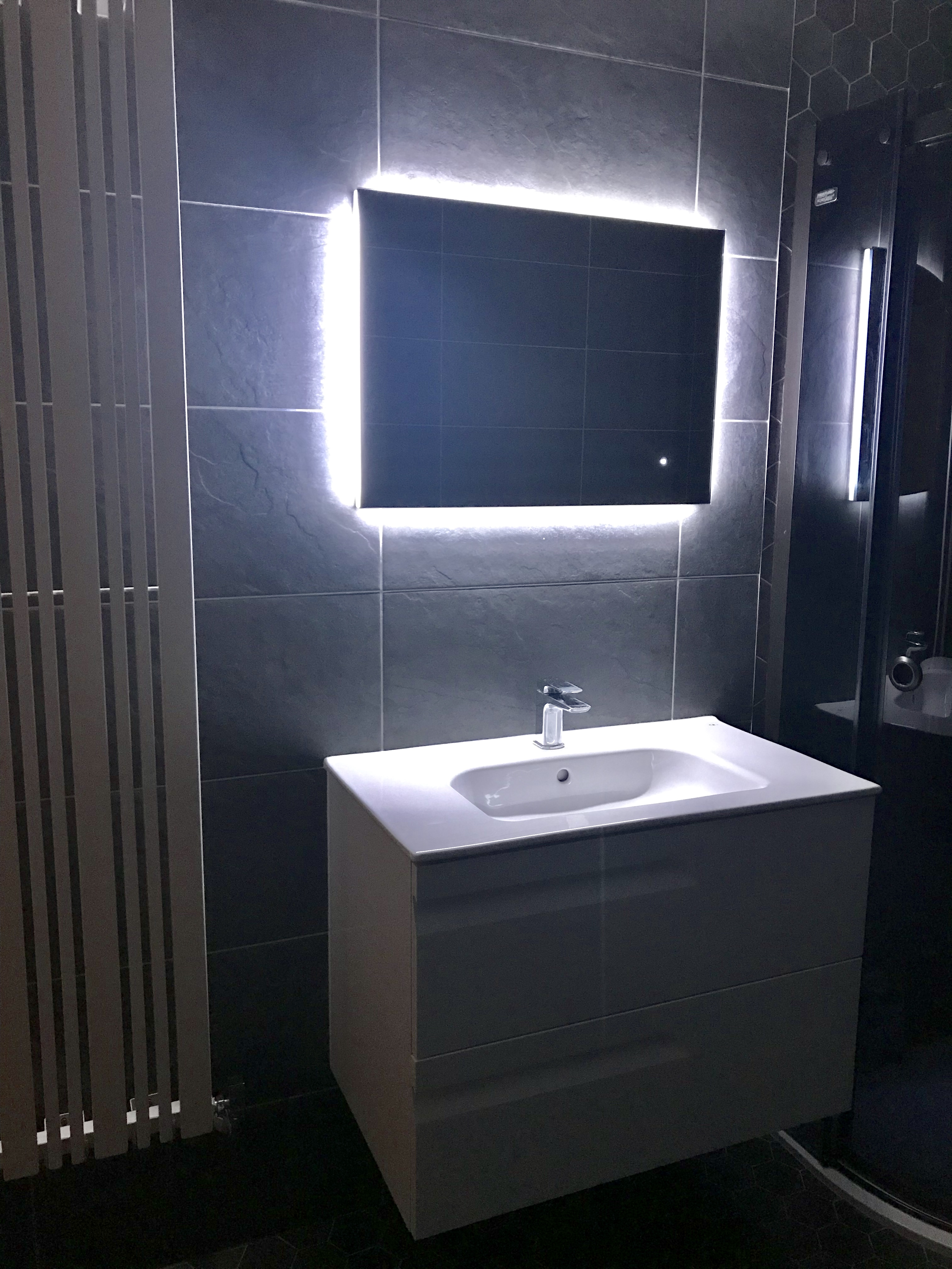 The centrepiece of this design is a sleek smoked glass quadrant enclosure, coupled with a Palermo thermostatic shower and a sophisticated Lumiere LED mirror. Adding to the allure are premium fittings including a RAK toilet, a Vitale white gloss wall-hung sink unit, and a designer radiator, all contributing to the room’s stunning aesthetic.
