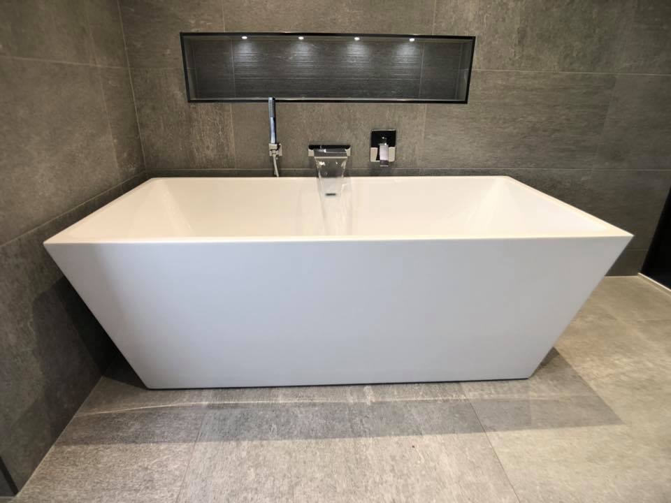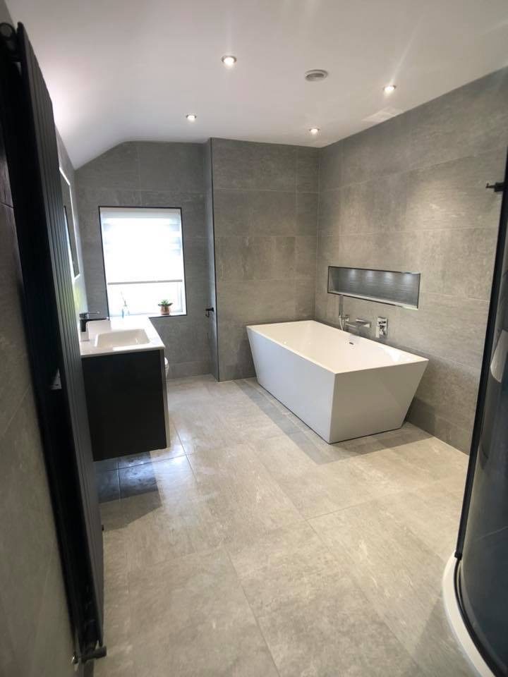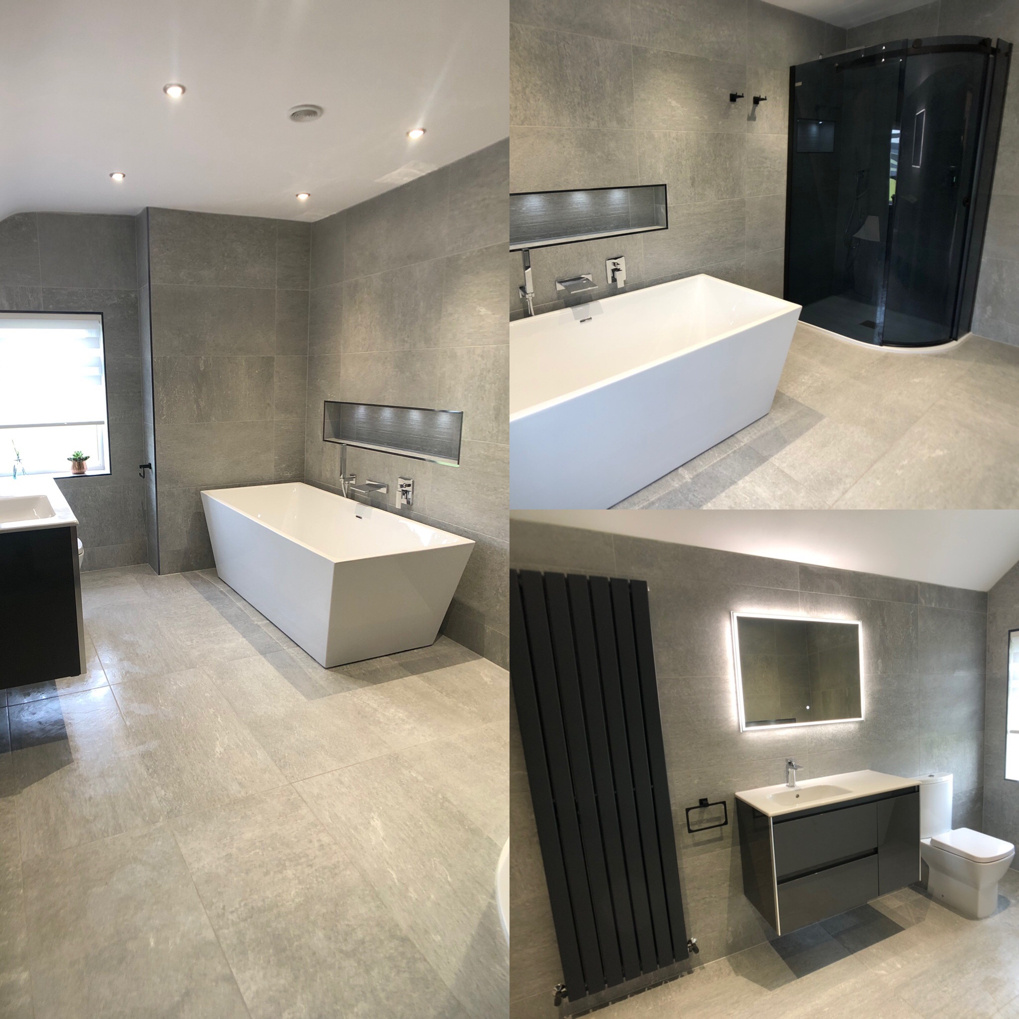 The minimalist Royo wall-hung basin unit and mirror maximise space, while the freestanding bath with a wall spout adds luxury. LED-lit niches offer ambient lighting and practical storage. Expertly designed and installed, this bathroom transforms your space into a sanctuary of luxury and style.
